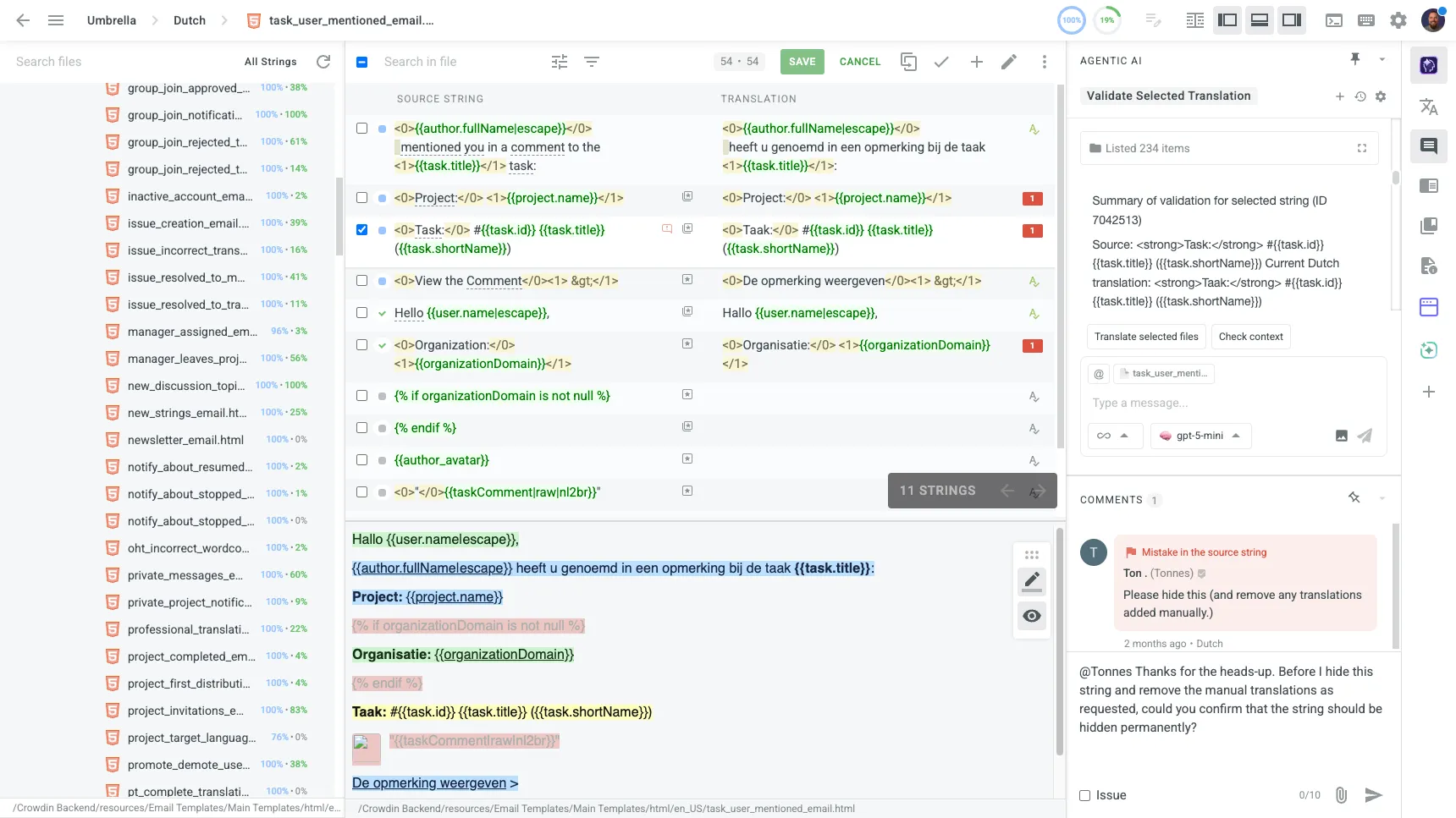 Use smart translation suggestions, AI proofreading, and automatic QA powered by OpenAI, Anthropic, Azure AI, and others. With Crowdin Context Harvester, collect real product context so AI can deliver more accurate, high-quality translations.